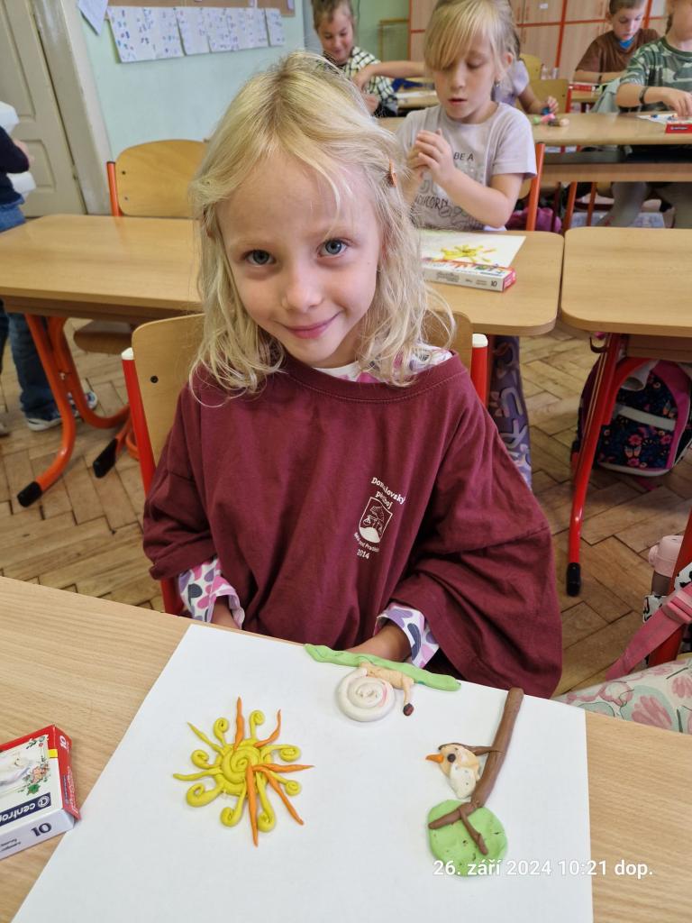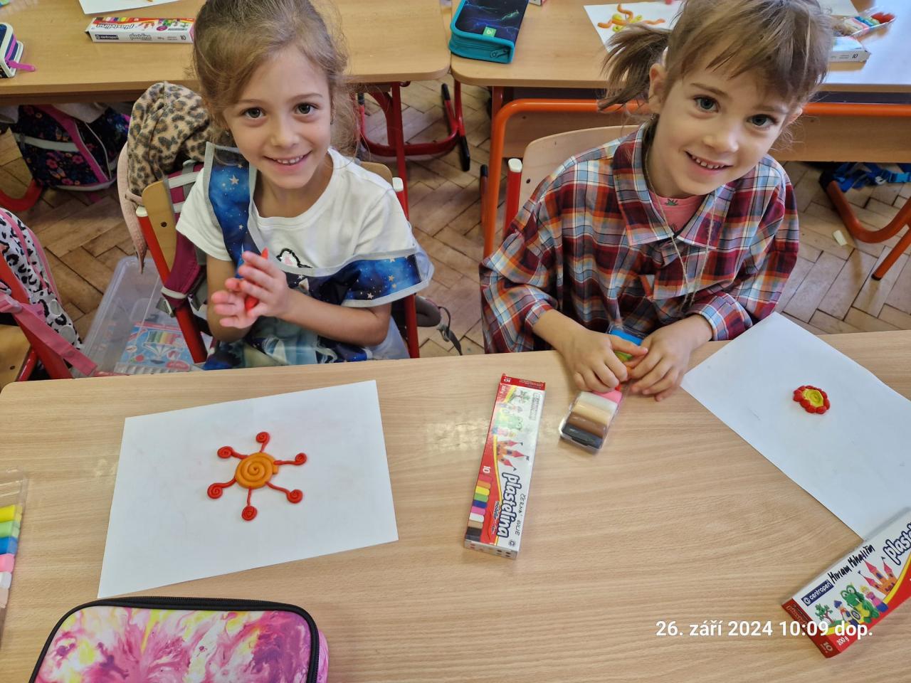 Obrázky z geometrických tvarů a grafomotorické cvičení s modelínou.