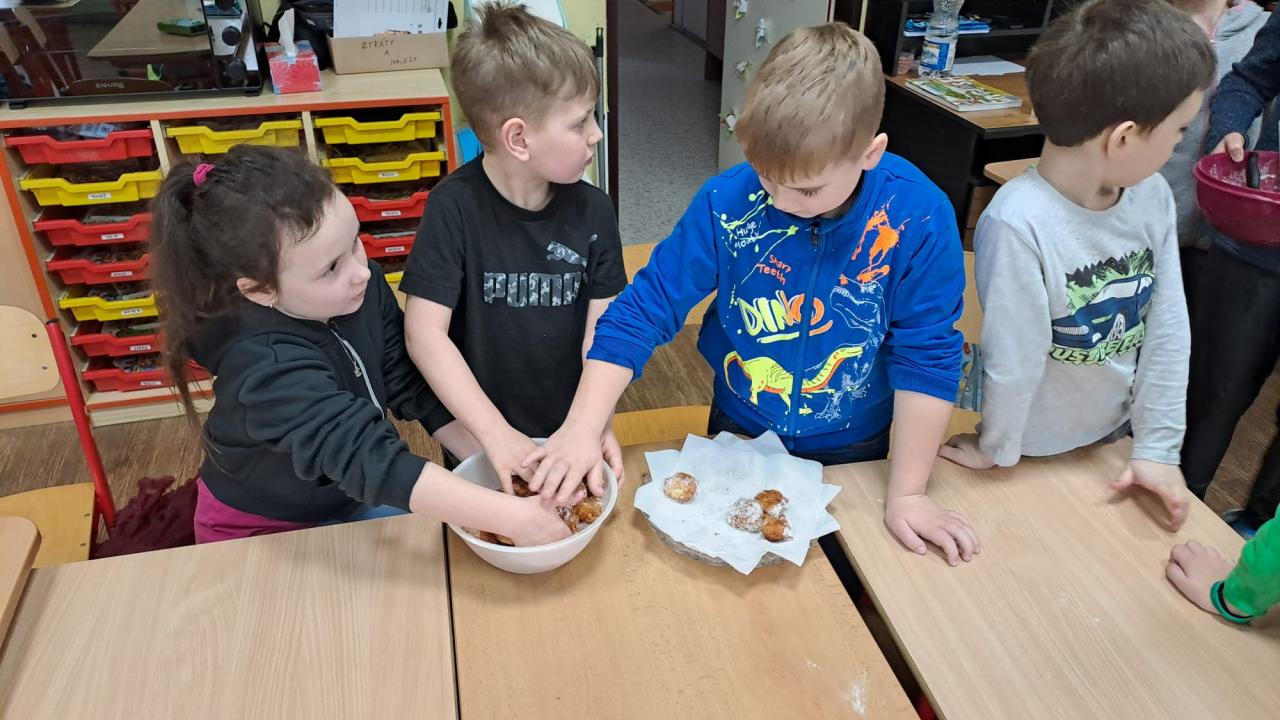19.2. už je sice období půstu, ale u druháků se rozvoněly masopustní koblihy, které si děti zapily limonádou podle receptu z pracovního sešitu. Tím jsme prakticky procvičili jednotky hmotnosti a objemu.